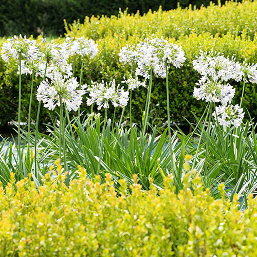 Dazzling white flowers floating above neat clumps of glossy green leaves, catching the summer light and adding a touch of the exotic to even the smallest garden. That's the magic of Agapanthus 'Pitchoune White', a compact African Lily that's bred for high impact and elegance in a manageable form.